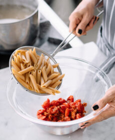 Cuocete le penne al dente e versatele nella ciotola con i pomodori. Mescolate delicatamente, distribuite la pasta nei singoli piatti e cospargetela con la ricotta grattugiata.