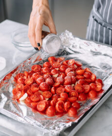 Scaldate il forno a 200°. Frullate 2-3 cucchiai di zucchero di canna fino a ridurlo in polvere. Lavate i pomodorini, asciugateli e tagliateli a metà.