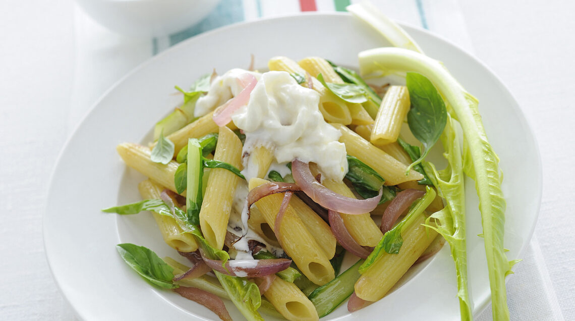 4) Distribuisci le penne cipolla e cicoria nei piatti, cospargile con le foglioline di basilico e completa il tutto con la burrata spezzettata; servi subito.