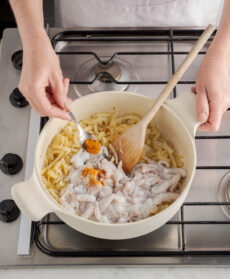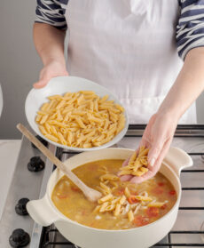 Aggiungete la pasta, mescolate e fate riprendere il bollore.