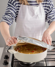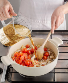 Lasciare insaporire ancora per 5 minuti, unite i pomodori e il brodo e portate ad ebollizione.