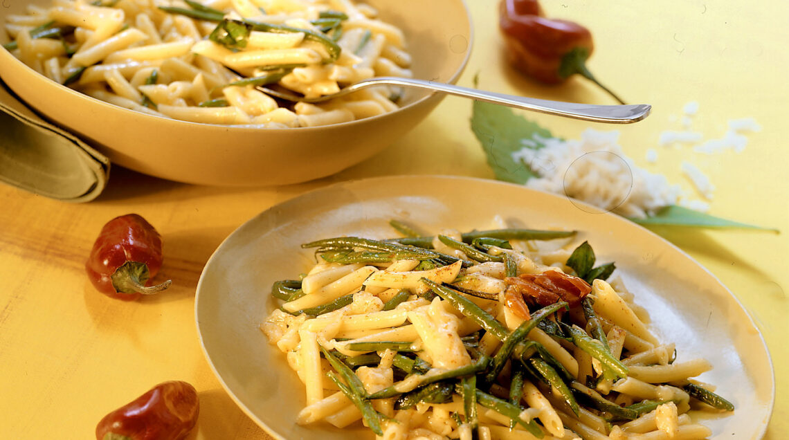 3) Scola la pasta al dente e condiscila subito con l'olio profumato e i fagiolini; aggiungi il formaggio grattugiato grossolanamente, mescola, spolverizza con una manciata di basilico spezzettato e servi subito.