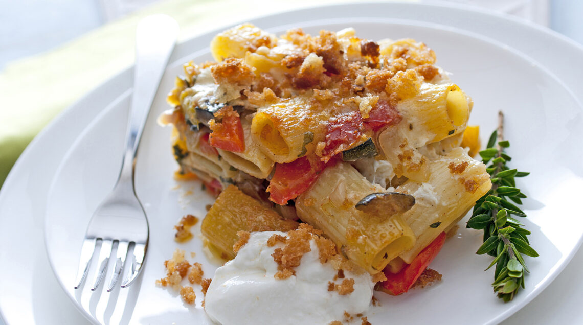 Prova la ricetta dei rigatoni con ratatouille, mozzarella e burrata, un primo piatto gustoso e facile da preparare.