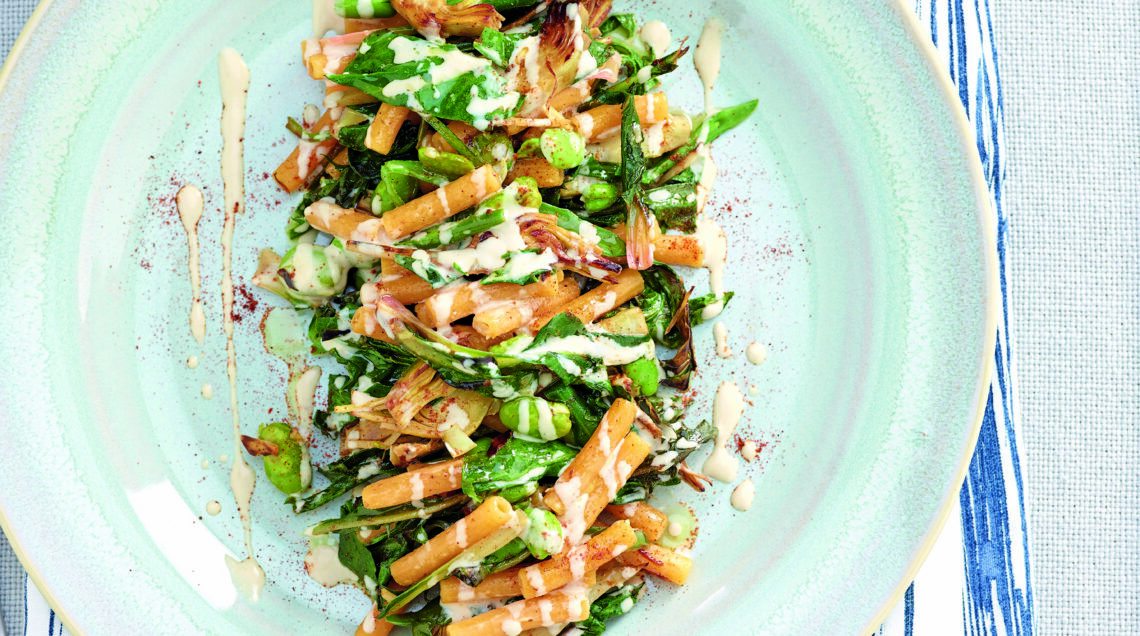 3 Lessate la pasta 8-10 minuti in acqua bollente salata, assaggiando per controllare la cottura. Intanto, mescolate tahina e miso e stemperate con 50 ml di acqua della pasta. Scolate i sedani e conditeli con questa crema, le verdure e 2-3 cucchiai di olio.