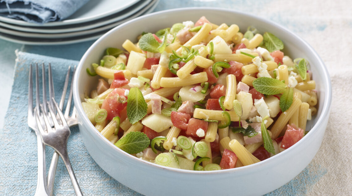 Una pasta per l'estate con frutta e formaggio, da preparare in anticipo e gustare fredda