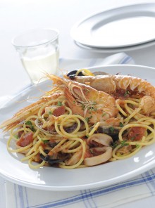 Spaghettoni con burrata, pomodorini e limoni sotto sale
