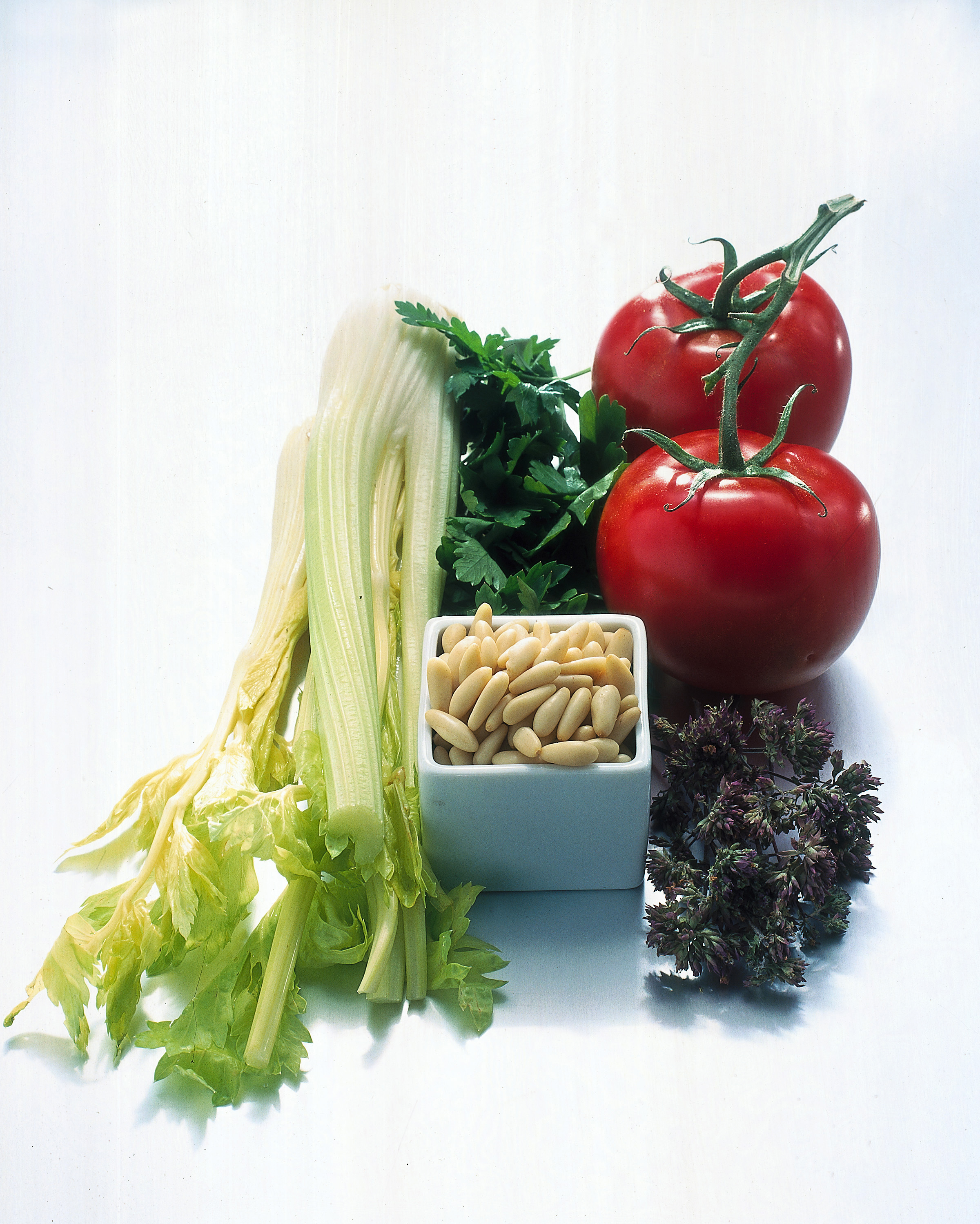 1) Per dare via alla ricetta della pasta al pesto ammaccato pesate 10 g di foglioline di prezzemolo e tritatele insieme a 10 g di sedano. Mettete il tutto in un mortaio, aggiungete i pinoli, sale, pepe e pestate il tutto fino a quando non ottenete un composto omogeneo.