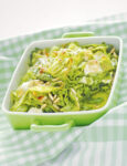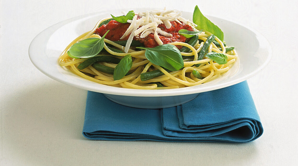 3) Mescola e porta la pasta a una cottura al dente. Scola spaghetti e fagiolini, distribuiscili nei piatti e condisci con il sugo e la ricotta salata.
