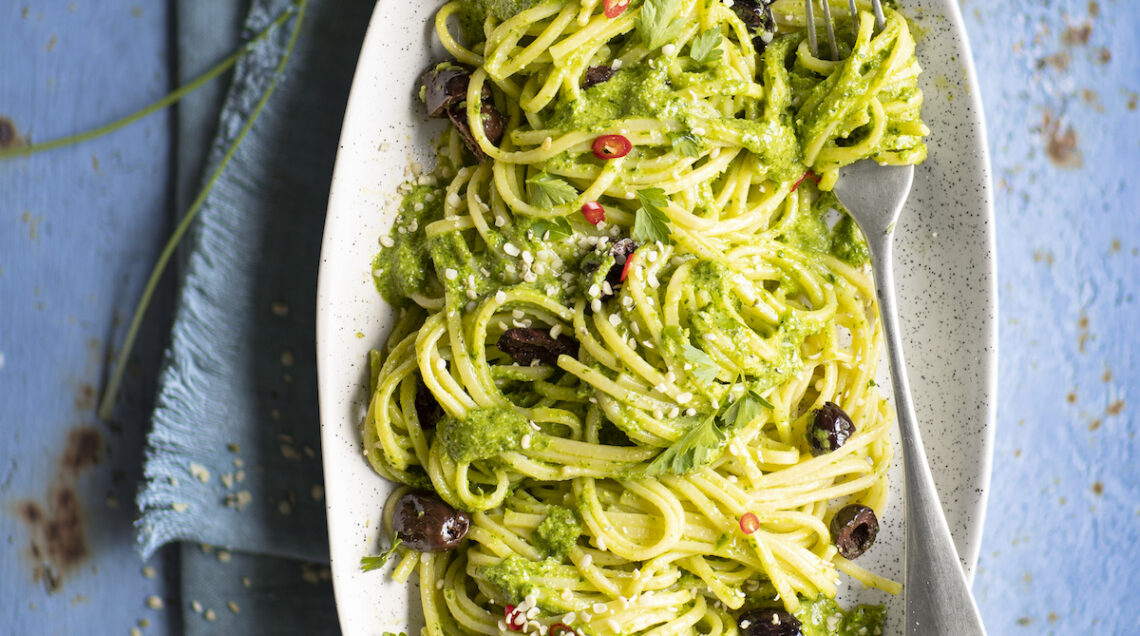 Il pesto di prezzemolo e semi di canapa è perfetto per questo primo piatto primaverile. Con olive e peperoncino