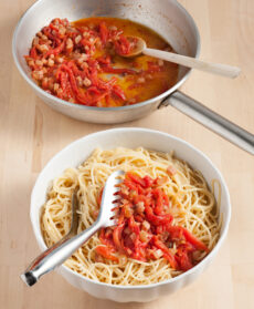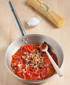 Una volta ultimata la cottura della salsa di pomodori aggiungete nuovamente in padella i dadini di guanciale, aggiustate ulteriormente di sale e lasciate insaporire per un paio di minuti; servite.
