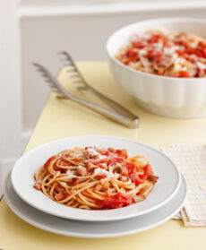 Condite gli spaghetti con la salsa per l'amatriciana, mescolate e servite passando a parte il restante pecorino.