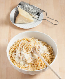 Portate a ebollizione in una pentola abbondante acqua salata e lessate gli spaghetti; che scolateli e metteteli in una ciotola calda spolverizzandoli con metà del pecorino.