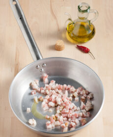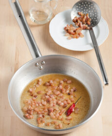 Unite quindi il peperoncino rosso piccante, bagnate il tutto con il vino bianco, lasciatelo evaporare. Scolate i dadini per l'amatriciana su un piatto e teneteli in caldo.