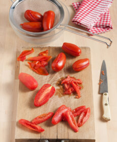 Incidete i pomodori nel senso della lunghezza, scottateli in acqua in ebollizione per pochi istanti. Scolateli, sbucciateli, eliminate i semi e tagliateli a filetti sottili.