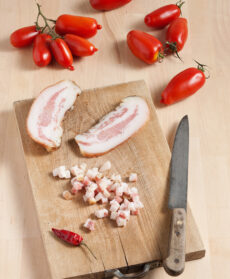 Eliminate la cotenna intorno al guanciale e tagliatelo a dadini. Lavate i pomodori.