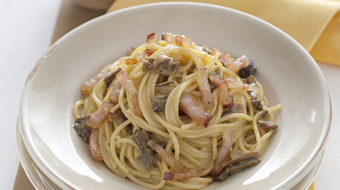 2) Rosola 1 spicchio d'aglio con poco olio in una padella. Unisci i funghi e cuoci per circa 5 minuti unendo, di tanto in tanto, poca acqua di ammollo dei funghi. Sala e togli l'aglio. Intanto, mescola in una ciotola 4 uova, 80 g di pecorino grattugiato e pepe. Soffriggi anche 120 g di guanciale a listarelle in un padellino antiaderente.