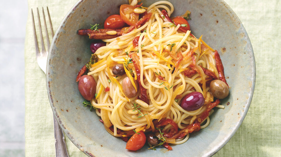 La pasta lunga, i ciliegini, i pomodori secchi, le olive e poi il sapore pungente dei cipollotti e quello scrocchiante dei pinoli annunciano al tempo stesso un primo fresco e la nuova stagione che vuole tra i protagonisti piatti veloci e leggeri, magari anche vegetariani come questo. Il ricordo dell'inverno passato rimane in quel succo d'arancia spruzzato sul condimento della caponatina che profuma di timo.