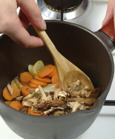 Affetta non troppo sottilmente la cipolla e le carote, e falle appassire con l'olio per 8 minuti. Unisci i funghi e la lattuga e prosegui la cottura per 10 minuti. Bagna con il brodo e fai sobbollire 5 minuti.