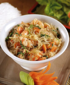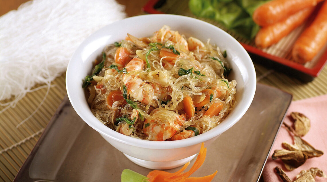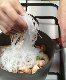 Servi all'istante gli spaghetti di soia con funghi e gamberi.