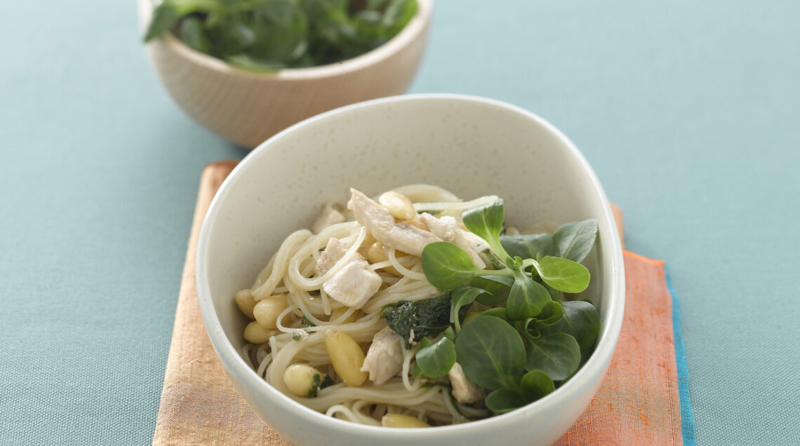 3) Lessa in acqua bollente 380 g di pasta di soia per 5 minuti; scolala al dente, saltala nella padella con 2-3 cucchiai di salsa di soia per 3 minuti. Servi gli spaghetti di soia con spada e menta.
