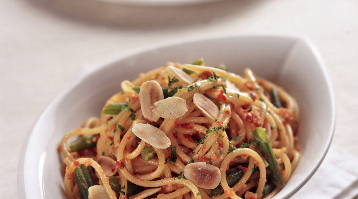 5) Scola spaghetti e fagiolini e trasferiscili subito nella zuppiera, mescolando e amalgamandoli con il pesto di pomodori e mandorle.