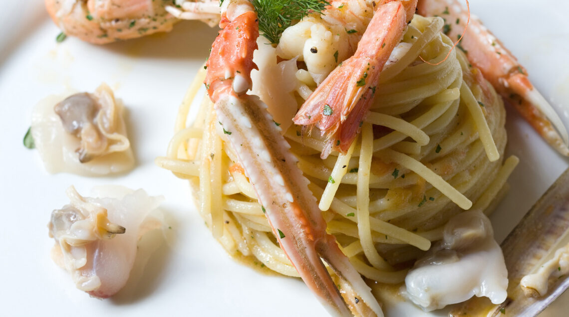 4) A metà cottura, trasferisci gli spaghetti nella padella del sugo ai frutti di mare e crostacei, e portali a cottura versando man mano un po' d'acqua bollente (o, in alternativa, di brodo di pesce). Condisci il tutto con un filo d'olio e unisci i calamaretti rimasti; rigira gli spaghetti e servili completando i piatti con le vongole, i calamaretti ed i gamberi crudi.