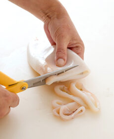 Pulite bene le cozze, privandole dei filamenti (bisso) e lavatele. Mettete le vongole in acqua fredda salata per 2-3 ore, cambiandola spesso, in modo da eliminare la sabbia contenuta all'interno. Pulite i gamberi: eliminate il filetto nero sul dorso, lavateli e asciugateli. Lavate anche i calamari e tagliuzzateli con le forbici. Trasferite le cozze nella padella con 1 spicchio d'aglio spellato, 1 bicchiere di vino e qualche gambo di prezzemolo, mettete il coperchio e cuocete finché si saranno aperte.