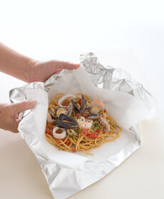 Portate a bollore abbondante acqua, immergete i calamari e cuoceteli per circa 40 minuti; salate leggermente l'acqua e tuffatevi gli spaghetti; scolateli molto al dente insieme ai calamari. Saltateli in padella con il sugo ai frutti di mare preparato mescolate bene e suddividete tutto in fogli di carta da forno posti su fogli di alluminio più grandi. Pepate, chiudete i cartocci con l'alluminio e infornate a 200° per 5 minuti. Togliete dal forno e disponete i cartocci sui piatti individuali; servite.