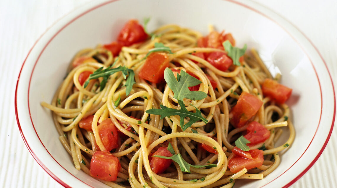 4) Spolverizza con le foglie di rucola tenute da parte e spezzettate e servi gli spaghetti integrali alla rucola.