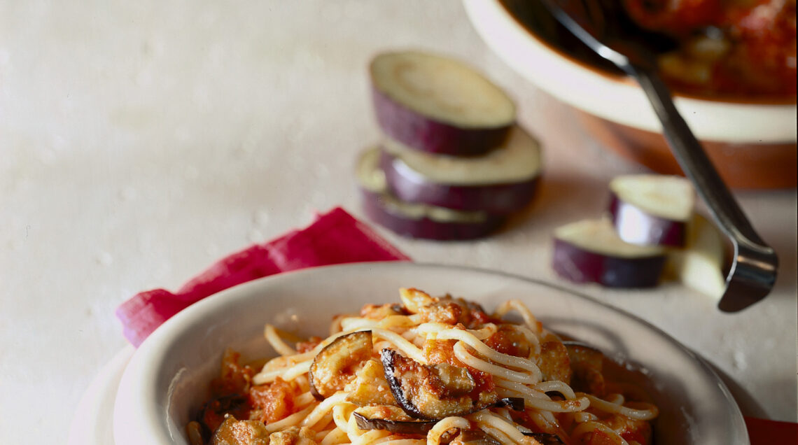 4) Intanto, cuoci gli spaghetti al dente in acqua bollente salata. Togli la pirofila dal forno, taglia le melanzane a pezzetti e versa sugo e melanzane sugli spaghetti. Mescolate e servi gli spaghetti con le melanzane al forno.