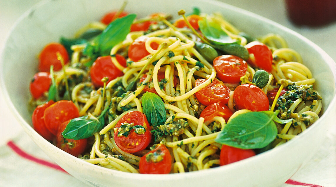5) Condisci subito gli spaghetti con pesto e pomodorini (privati dell'aglio), guarnisci con i frutti di cappero e, per dare un tocco in più, con foglioline di basilico.