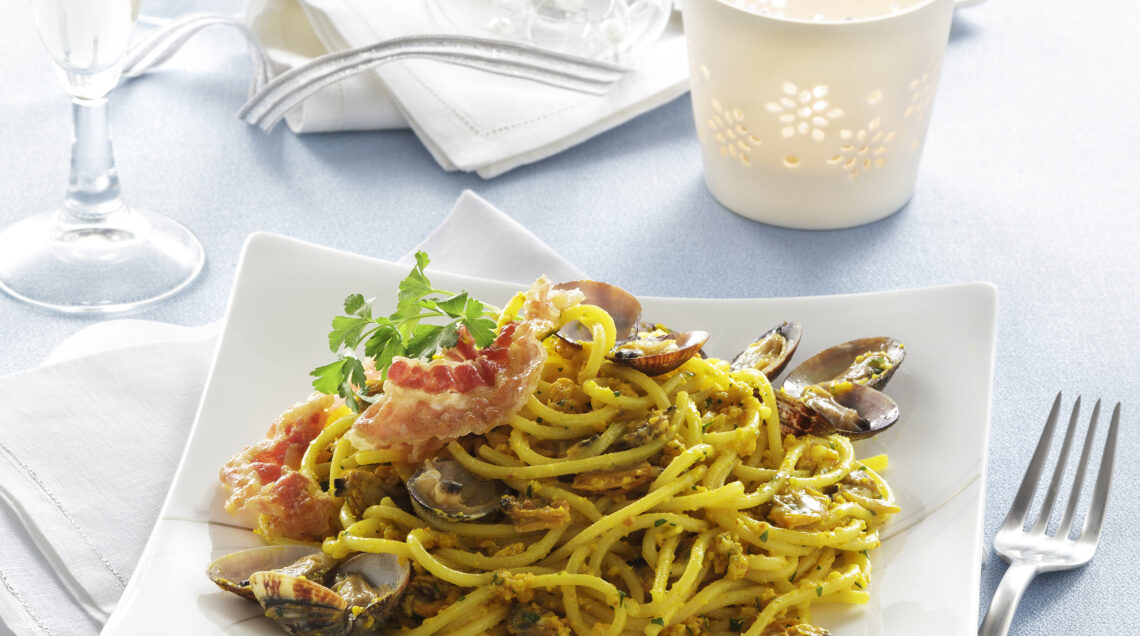 4) Versa nel tegame del bacon gli spaghetti sgocciolati al dente, le vongole, il pepe e il composto di pane. Salta il tutto per pochi istanti sul fuoco, distribuisci nei piatti e completa con il bacon.