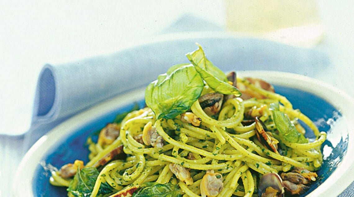 4 Versate il fondo di cottura delle vongole in una padella e lasciatelo ridurre parzialmente. Aggiungete la pasta cotta molto al dente, le vongole in parte sgusciate e il pesto; mescolate, coprite e fate riposare per un minuto.