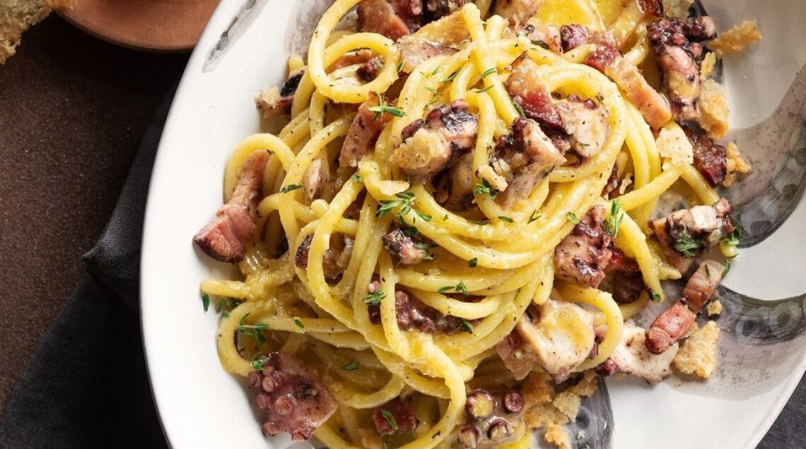 4 Cuocete gli spaghettoni in abbondante acqua moderatamente salata. Nel frattempo, in una terrina, sbattete l'uovo e i tuorli con il pecorino e un pizzico di pepe. Scolate la pasta e unitela al polpo e alla pancetta e mescolate bene.