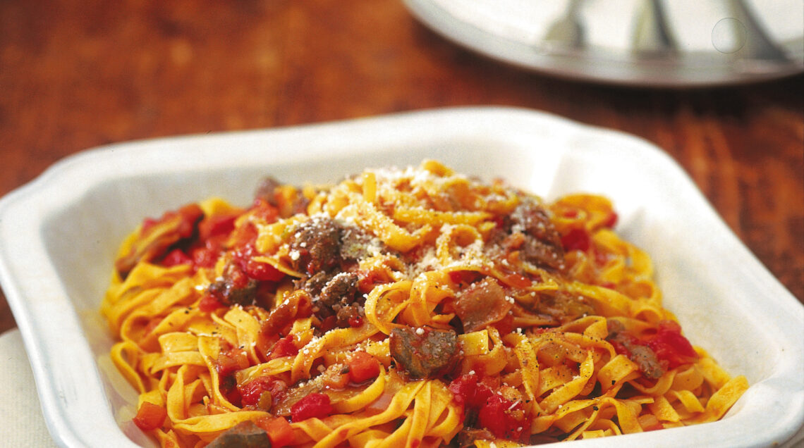 1) Cuoci le fettuccine in abbondante acqua non troppo salata, scolale e condiscile con il sugo ben caldo e il burro restante.
