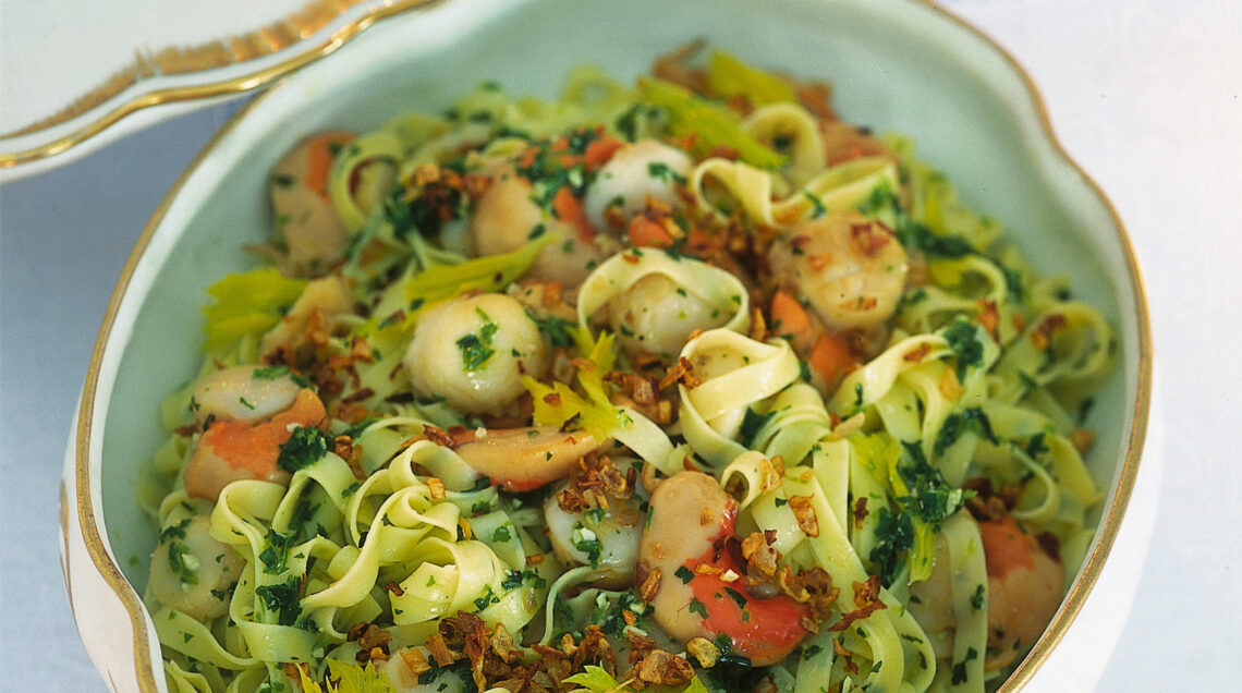 4) Cucina le tagliatelle all’uovo, diluisci il pesto di sedano con 2 cucchiai di acqua di cottura e usalo per condire la pasta appena scolata. Unisci metà delle capesante alla pasta con il pesto, trasferisci il tutto in una zuppiera, aggiungi le altre capesante e prima di servire finisci con un filo d’olio.