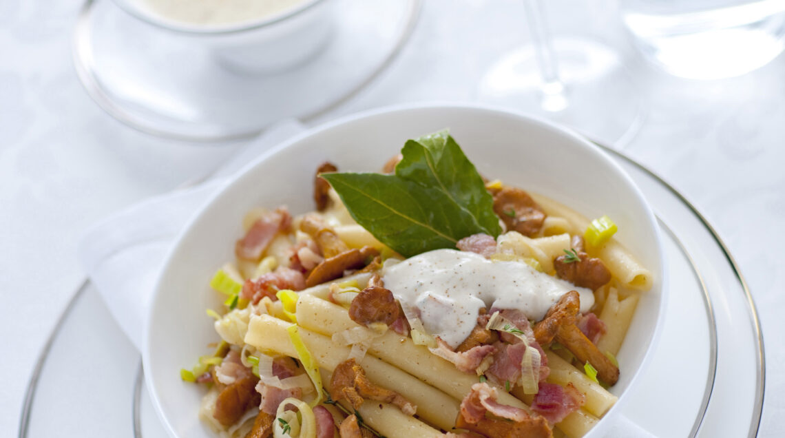 5) Servi gli ziti spezzati con finferli al bacon con la fonduta di grana padano.