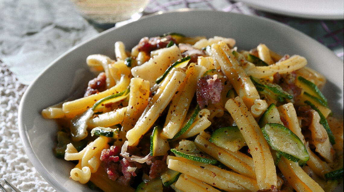 6) Scolatela al dente, versala nella padella, mescolate a fiamma media per qualche minuto,aggiungi il parmigiano ridotto in scagliette, profuma con un'abbondante macinata di pepe e servite subito la pasta con zucchine e salamelle.