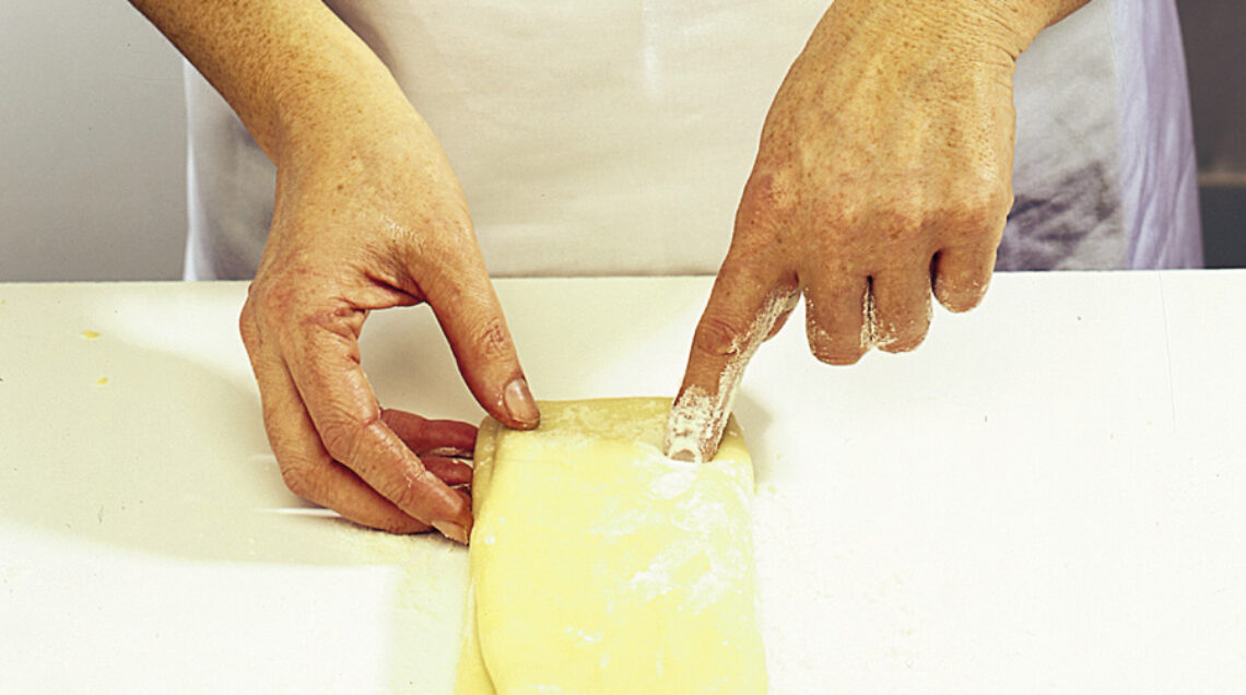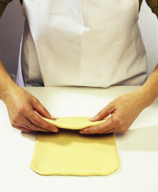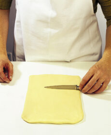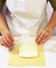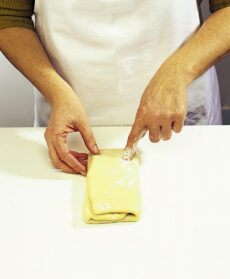 4) Riprendi la pasta dal frigo e stendila fino a formare un quadrato. Al centro metti il burro appiattito. Ripiega i bordi della pasta e stendila di nuovo. In questo modo si creerà una sfoglia di burro all’interno della pasta. Lavora la pasta formando un rettangolo, dividilo in 3 parti e ripiega la pasta a libro. Segna questo primo giro con una tacca sulla pasta e lascia riposare in frigo per 15 minuti.