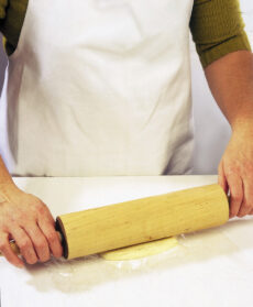 3) Con il mattarello appiattisci un panetto di burro da 200 g fino a un cm di spessore. Per farlo, utilizza due fogli di pellicola trasparente, tra i quali mettere il panetto.