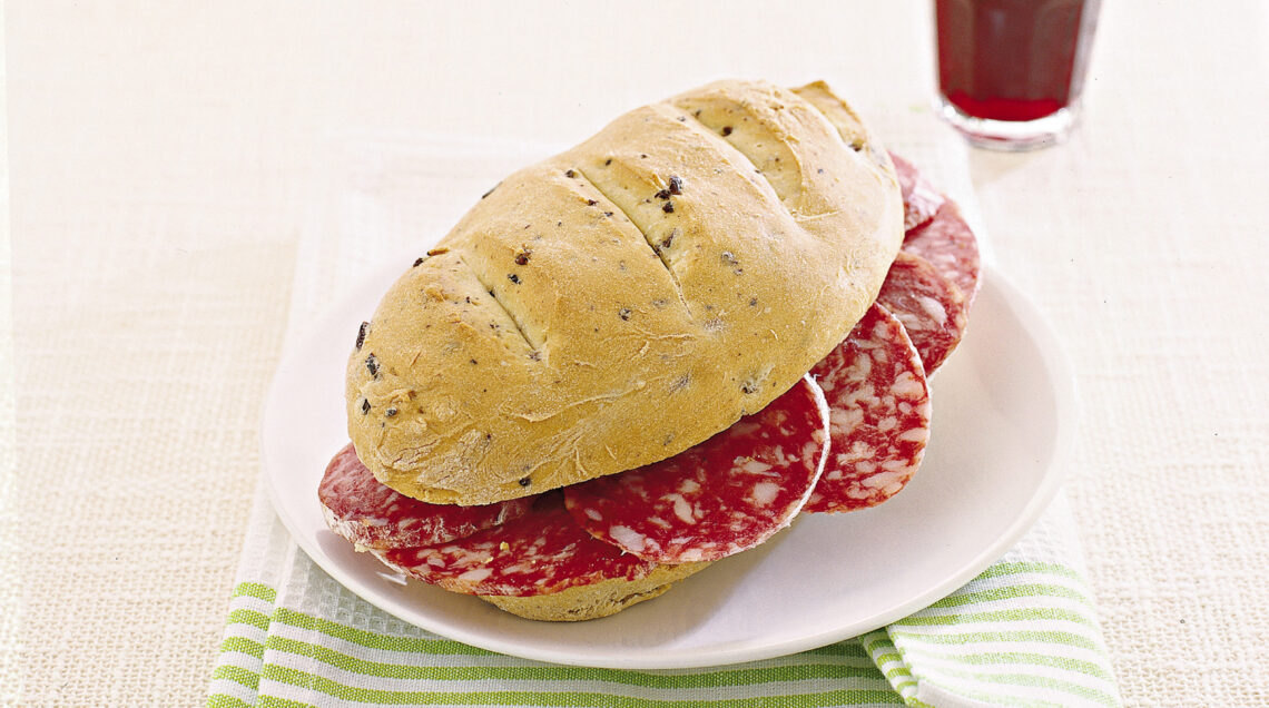4) Ultima la ricetta del panino alle olive con una farcitura di salame felino a fette.