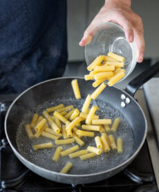 Versate i rigatoni in padella, unite 2 dita di acqua leggermente salata e l'olio e portate la pasta a cottura mescolando a fuoco basso e aggiungendo altra acqua solo se necessario.