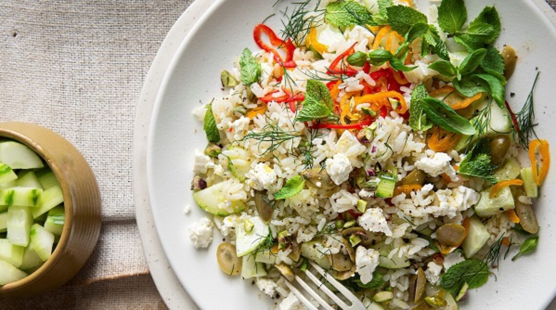 4 Versate il riso su una placca e fatelo raffreddare. Quando è a temperatura ambiente trasferitelo in una ciotola e mescolatelo con gli altri ingredienti. Regolate di sale, pepate, completate con le foglie di menta e basilico e servite.