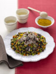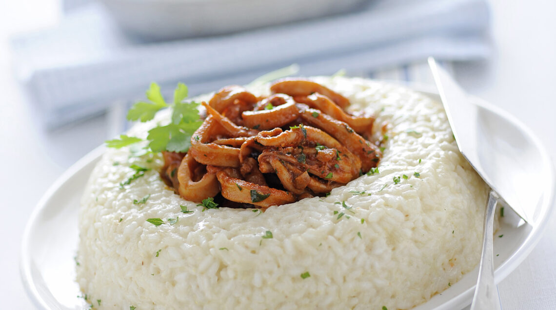 4) Completa e servi. Imburra uno stampo a ciambella con il burro rimasto, versa il riso e compattalo bene livellando la superficie con una spatola. Sforma il riso su un piatto da portata e aggiungi al centro i totani e il sugo di cottura. Servi la corona di riso pilaf con calamari subito.