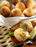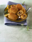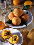1) Prepara il riso per gli arancini. Pulisci e trita finemente una grossa cipolla bianca; appassisci la metà in una casseruola con 30 gr di burro. Versa il riso e tostalo per 1-2 minuti su fiamma moderata fin quando diventa traslucido; bagna con 1/2 bicchiere di vino bianco secco e lascialo evaporare su fiamma vivace. Unisci 2 mestoli di brodo di carne bollente e cuoci per circa 15 minuti, abbassando la fiamma e aggiungendo altro brodo man mano che il riso lo assorbe. Verso gli ultimi minuti di cottura incorpora 1 bustina di zafferano diluita in 1/2 mestolo di brodo. Togli dal fuoco, manteca il grana padano grattugiato e lascia intiepidire. Incorpora i tuorli e versa il composto di riso in una teglia foderata con carta da forno allo spessore di 2 dita e lascialo raffreddare completamente.