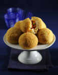 4) Forma gli arancini di riso siciliani e completa la preparazione. Fai con il composto di riso, tante palline grandi quanto un grosso uovo, pratica un'apertura nel mezzo e farcisci ogni pallina con un cucchiaio di ragù di pesce spada che hai preparato. Per evitare che gli arancini si aprano in cottura, compattali bene, bagnandoti ogni volta le mani in acqua fredda. Passa poi gli arancini, prima nella farina, poi nell'uovo sbattuto e infine nel pangrattato.