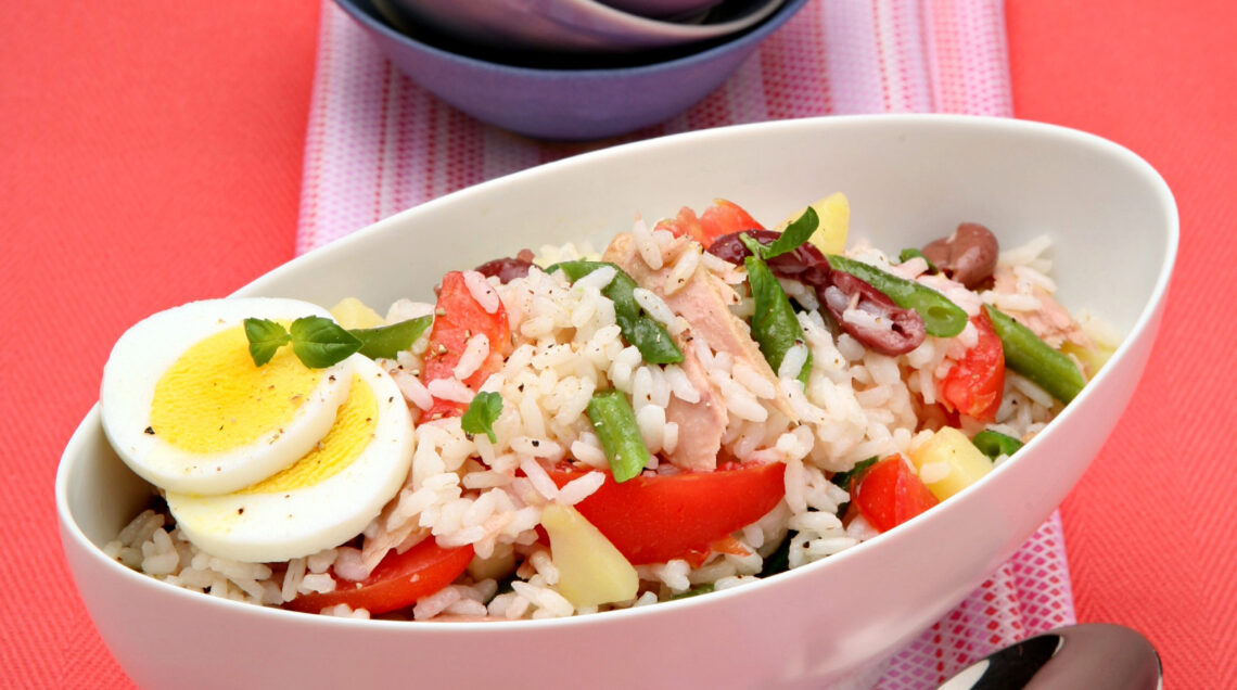 1) Lessa in acqua salata il riso, scolalo e fallo raffreddare. Rassoda le uova, raffreddale, sguasciale e tagliale a rondelle.