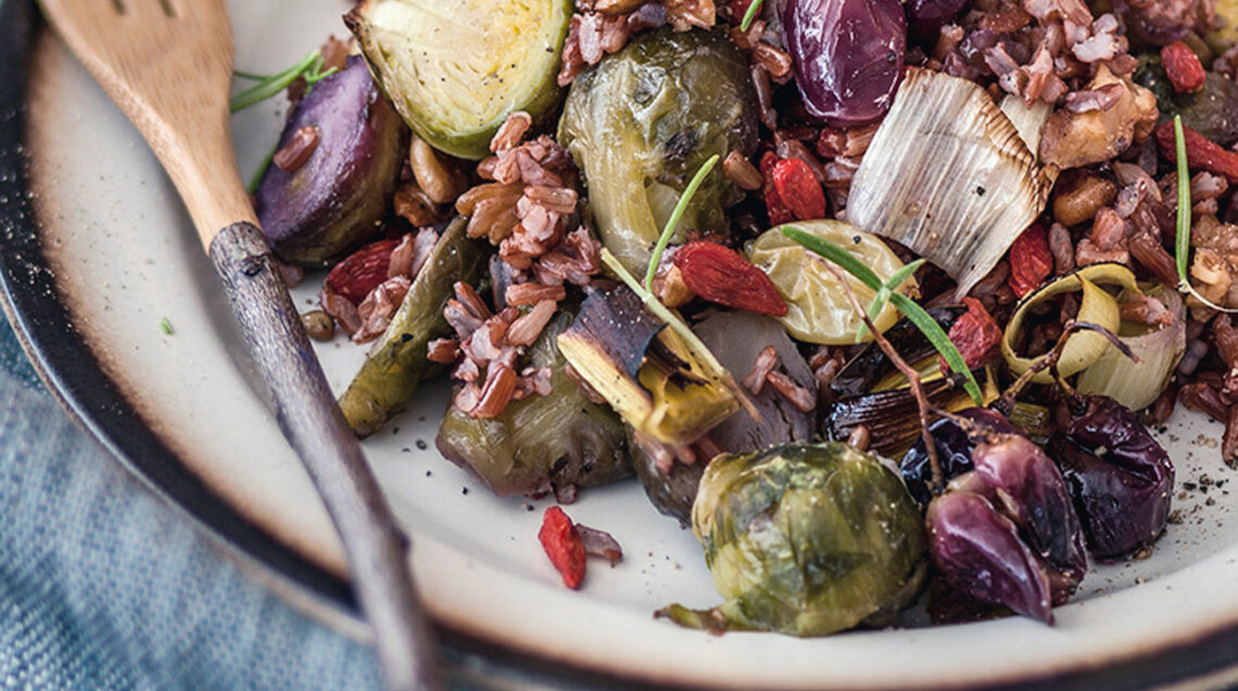 2 Spezzettate grossolanamente le noci. Rivestite una teglia di carta da forno e distribuitevi le verdure, le noci e le bacche di goji. Irrorate con 2 cucchiai d'olio, condite con un pizzico di sale e infornate a 180° per 25-30 minuti, mescolando di tanto in tanto. A metà cottura unite anche l'uva.
