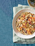 Gli spiedini di pollo sono marinati, cotti alla griglia e serviti con una salsina al coriandolo. Altrettanto sfizioso il pilaf di riso selvaggio con uvetta e mirtilli.