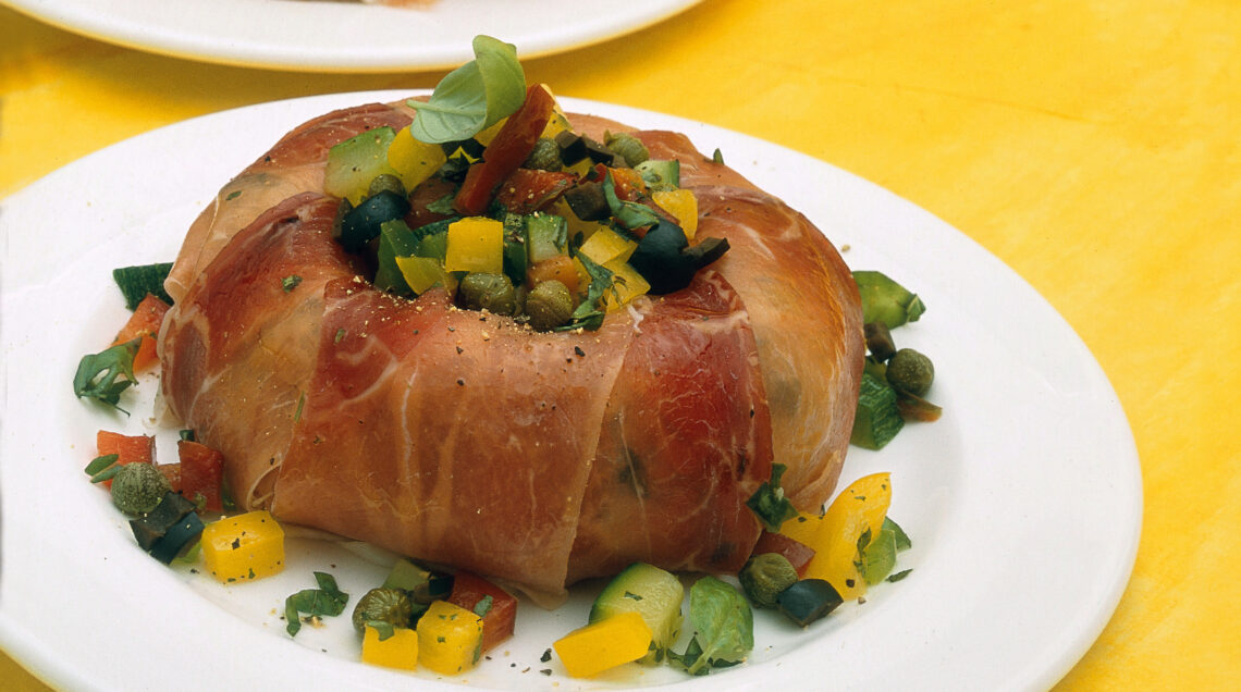 Semplice, simpatico, raffinato e goloso, questo piatto estivo è racchiuso in saporitissime fettine di speck. Il riso, condito con verdure appena bollite e crude, è insaporito con capperi e olive. Si prepara anche in anticipo e si conserva un paio di giorni in frigorifero prima di essere avvolto dal salume altoatesino, piacevolmente affumicato.